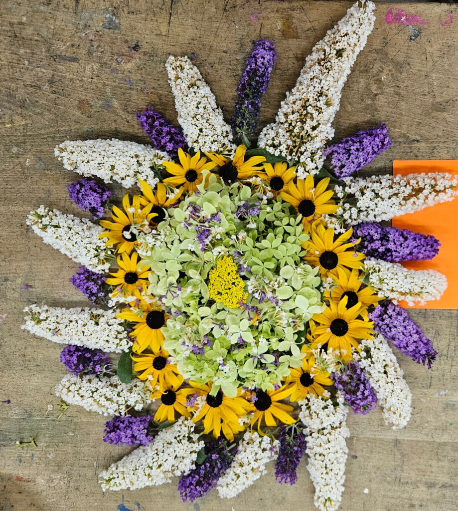 Aufgabe in WTK JG 4: Die Schüler und Schülerinnen sollen die Blütenblätter mit verschiedenen Mustern zeichen und und die Ränder mit einem Farbverlauf von einer Primär- zu einer anderen Primärfarbe füllen. Vier dieser Zentangle-Einheiten wurden dann zu einer Blume zusammen gesetzt.